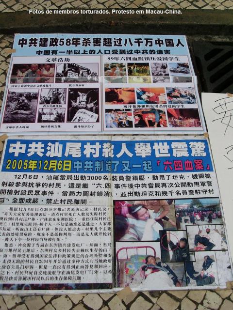 Além disso, pude ver várias fotos que mostravam membros da Falun Gong (http://pt.wikipedia.org/wiki/Falun_gong) totalmente dilacerados devido a tortura sofridas pelo governo chinês. Acho que vocês não tão me entendendo, estou falando de protestos contra o governo chinês, DENTRO DA CHINA. Isso é algo impensável de ocorrer dentro da China continental (O polonês, namorado da chinesa que me hospedou, falou que por várias vezes, antes de acessar a internet na China continental, pediram o passaporte dele pra poder fazer uma cópia).