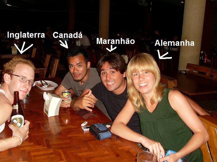 Fazer mergulho foi da hora, mas legal mesmo foram as amizades que fiz enquanto mergulhava. Acabei ficando amigaço de um inglês doido (que depois foi comigo pra Ko Phangan e inclusive dividimos quarto) e um canadense MUITO figura! O canadense era engraçado demais. Os pais dele eram de Macau, mas ele era igualzinho um tailandês. Além de que, depois conversando com ele, aprendi que todo canadense coloca uma bandeira do Canadá na sua mochila, não porque eles sejam orgulhosos de serem canadenses, mas sim porque eles sentem orgulho de não ser americanos, hehehe. Segundo ele falando, as pessoas sabiam que ele era canadense desta maneira: