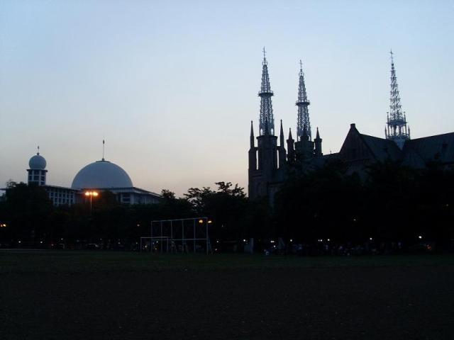 | A maior mesquita de Jakarta fica em frente a maior catedral. Nao, eles nao ficam jogando foguetes um em cima dos outros o dia inteiro. Isso se chama liberdade de crenca. |
