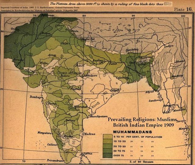 Mapa indiano com as respectivas concentrações islâmicas no país. Quanto mais verde-escuro, maior a porcentagem de muçulmanos na população. Note que as duas maiores concentrações, e que depois se tornaram Paquistão e Bangladesh, estão situadas em lados opostos.