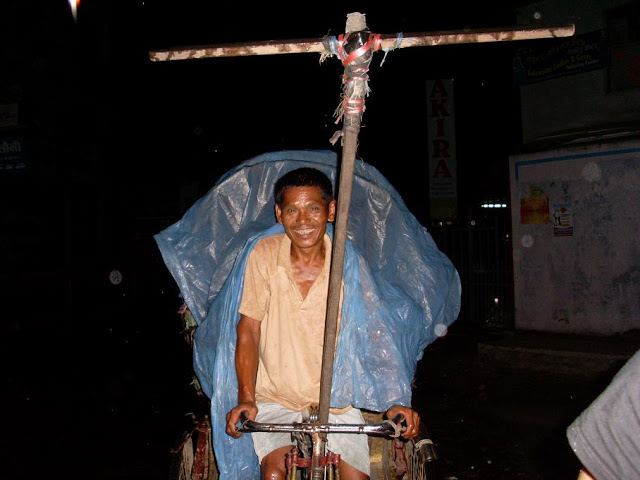 Pô, doido, teve uma vez que a gente pegou uma charretinha pra voltar do centro de Katmandu pra casa. Não era que a charretinha era movida a motor de moto (como na Tailândia) ou a cavalo, ela era movida a TRAÇÃO HUMANA! Em outras palavras! O cara colocava nós dois lá dentro e ia pedalando LADEIRA ACIMA!! Imagina, doido?? Você pedalar uma bicicleta com três pessoas por meia hora e ainda por cima subindo ladeira? No final o cara foi lá e cobrou 35 rúpias, o que dá menos que um real. Samanta, não se fez de rogada, deu 50 rúpias e pediu os 15 de troco. E nem adiantou o cara chorar!