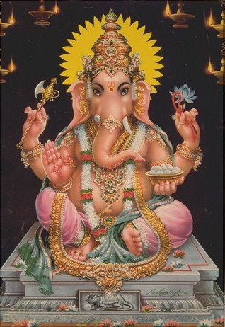 Ganesh com certeza é o Deus mais facilmente reconhecido dentre todos e um dos mais populares entre os Hindus. É de longe o meu Deus favorito (comprei até um mouse-pad dele) e o que tem a história mais engraçada. Ganesh é o famoso Deus com cabeça de elefante e Deus da prosperidade, boa-sorte, sabedoria, removedor de obstáculos etc.