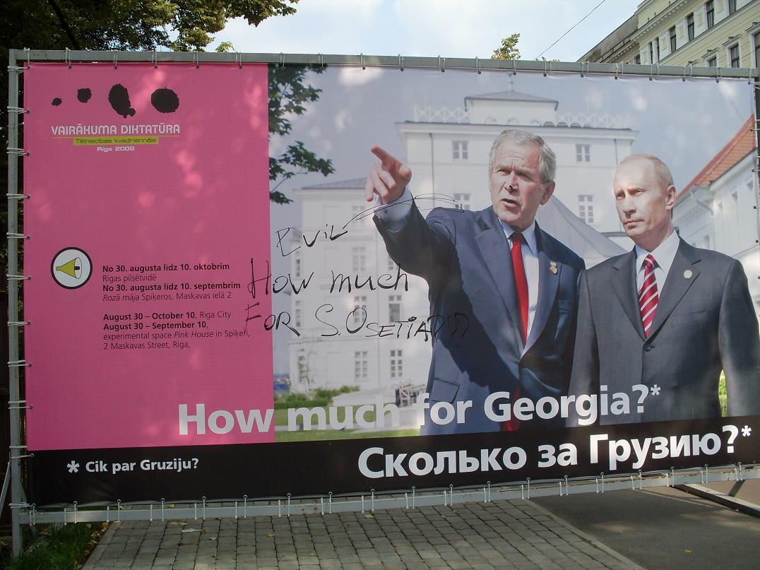 Quanto você dá pela Geórgia? Cartaz espalhado pelas ruas de Riga, Letônia, fazendo alusão às grandes potências (Rússia e EUA), traçando o mundo à sua maneira. Foi colocada para estimular o debate acerca do tema que a Iveta falava comigo…
