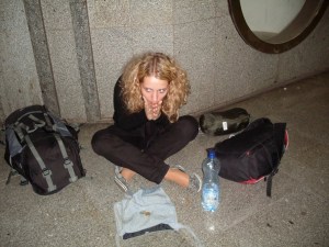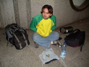 Compramos cada um um copinho de café (eu ODEIO café, mas naquele frio eu estava topando qualquer coisa pra poder aquecer. Aceitava até a companhia de um italiano lambedor de selos ou um canguru australiano) e ficamos pensando no que poderíamos fazer na estação enquanto aguardávamos a nossa carona. Como estávamos sem fazer nada, resolvemos tentar conseguir algum dinheiro.