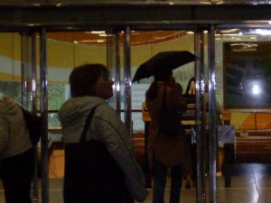 Também batemos algumas fotos de pessoas estranhas dentro do metrô, como essa maluca que ficava caminhando dentro da estação com o guarda-chuva aberto.