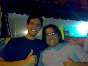 Outra que ocorreu comigo foi quando eu estava em um barzinho com amigos e um cidadão me abordou falando que lia meu blog. O nome dele era Maurício (viu, Maurício? Eu lembrei!) e o bicho disse que fazia Direito na UnB. Tirei uma foto com o bicho prometendo colocá-la no blog depois. Até aí tudo bem. Rapaz… Quando foi uns três dias depois… Vocês nem sabem! Fui pra um happy-hour da UnB com uns amigos e quem eu encontro por lá? Olha só, ele mesmo! Maurício! Mais louco que o Robocop na chuva! Rapaz, o bicho chega passava era de cinco em cinco minutos falando: – Esse aqui é o Claudiomar! O bicho tem um blog muito legal!! Passava dois minutos e vinha ele caindo por cima de mim e falando de novo: Esse aqui é o Claudiomar, ele é muito legal!! Hahaha. O mlk era muito engraçado. Vai a foto do figura (sóbrio) aí pra vocês verem!