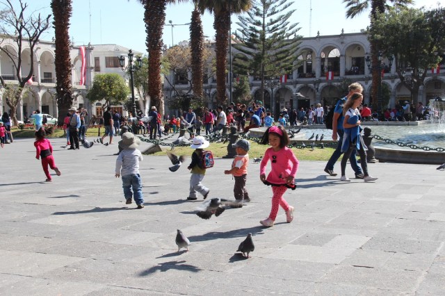 Enquanto no Brasil a gente se refere aos pombos como ratos de asa, eles não parecem ser um problema em Arequipa. Rapaz, você andava pela praça, era pombo para todo lado e a meninada fazendo a festa. O mesmo ritual: