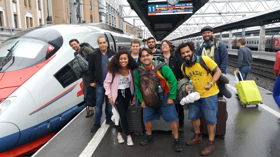 São Petersburgo e Moscou são as duas cidades mais importantes da Rússia e, para os padrões russos de distância, são quase que vizinhas. Como uma era bem perto da outra, decidimos ir de trem para ter uma experiência de viagem de trem na Rússia. Na verdade, na verdade a gente tava pensando era em encontrar outros brasileiros no trem e ir tacando aquela zona. A FIFA oferecia, inclusive, um trem de graça para se viajar entre as duas cidades para quem tivesse FAN ID (um crachá que só tinha quem tivesse comprado algum ingresso para Copa), porém ele levava nove horas e era noturno. Preferimos pegar um trem-bala que era bem mais rápido, levava umas quatro horas, apesar de ele custar quase que 95% do preço de uma passagem aérea. Ah, mano, nunca tinha viajado de trem bala, então valeu a experiência.