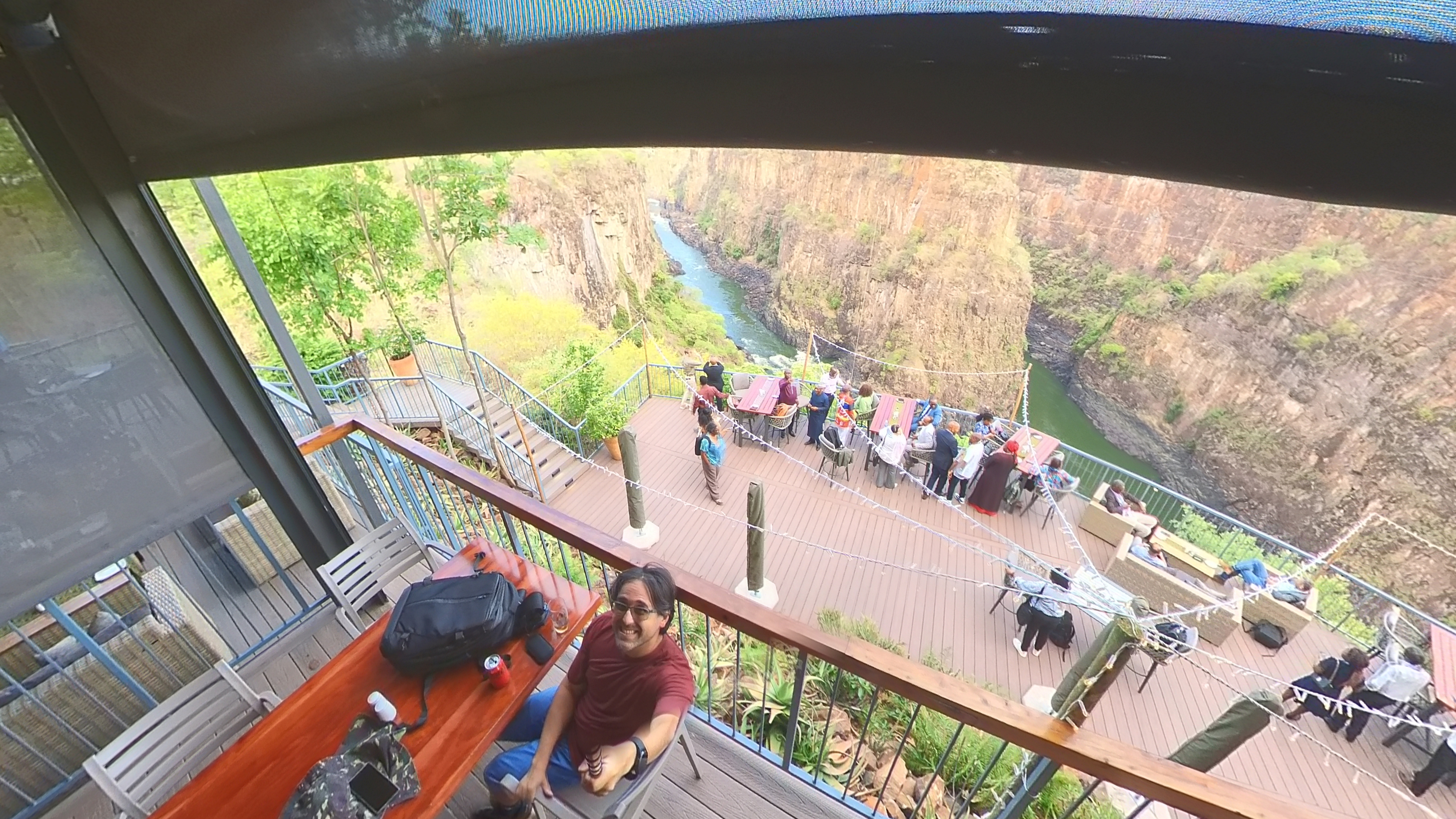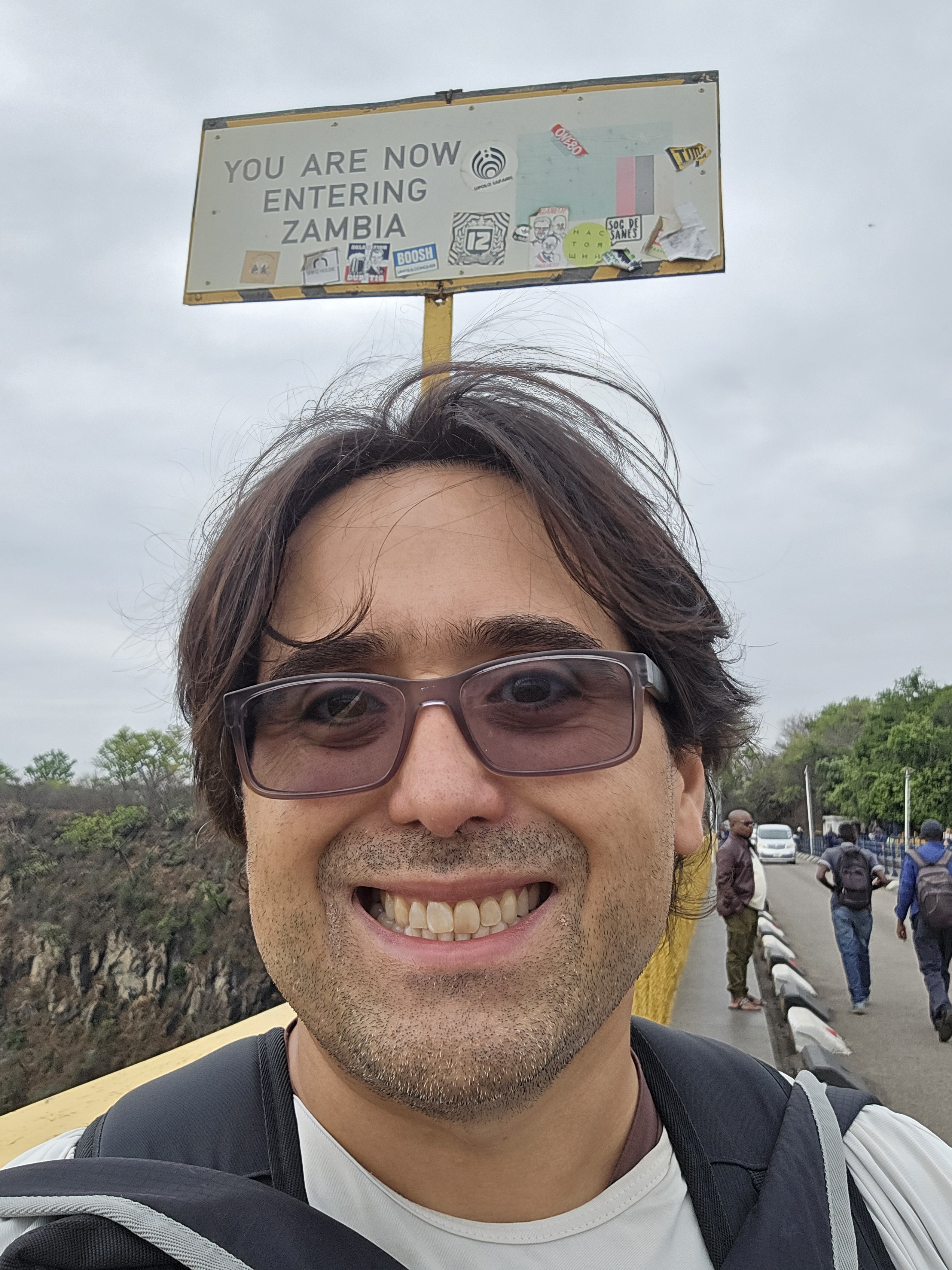 Para chegar à Zâmbia, peguei um voo de Joanesburgo, África do Sul — um dos principais hubs aéreos da África — até a cidade de Victoria Falls, no Zimbábue. Do aeroporto, tomei um táxi até a fronteira e, de lá, segui caminhando até a Zâmbia. Sim, andando mesmo: é uma caminhada de uns 20 minutos entre uma imigração e outra. Eu até poderia ter pago cinco dólares para atravessar de táxi, mas vou te dizer… andar foi bem mais legal. No caminho, parei na ponte que separa os dois países, construída no início do século passado a mando de Cecil Rhodes como parte do ambicioso plano de criar uma ferrovia ligando a Cidade do Cabo, na África do Sul ao Cairo, no Egito. Só essa parada na ponte já valeu os cinco dólares economizados. Ainda vi uma fila imensa de caminhões esperando para cruzar a fronteira. Até conversei com um caminhoneiro que disse que às vezes ficam o dia inteiro ali, só esperando autorização para atravessar.