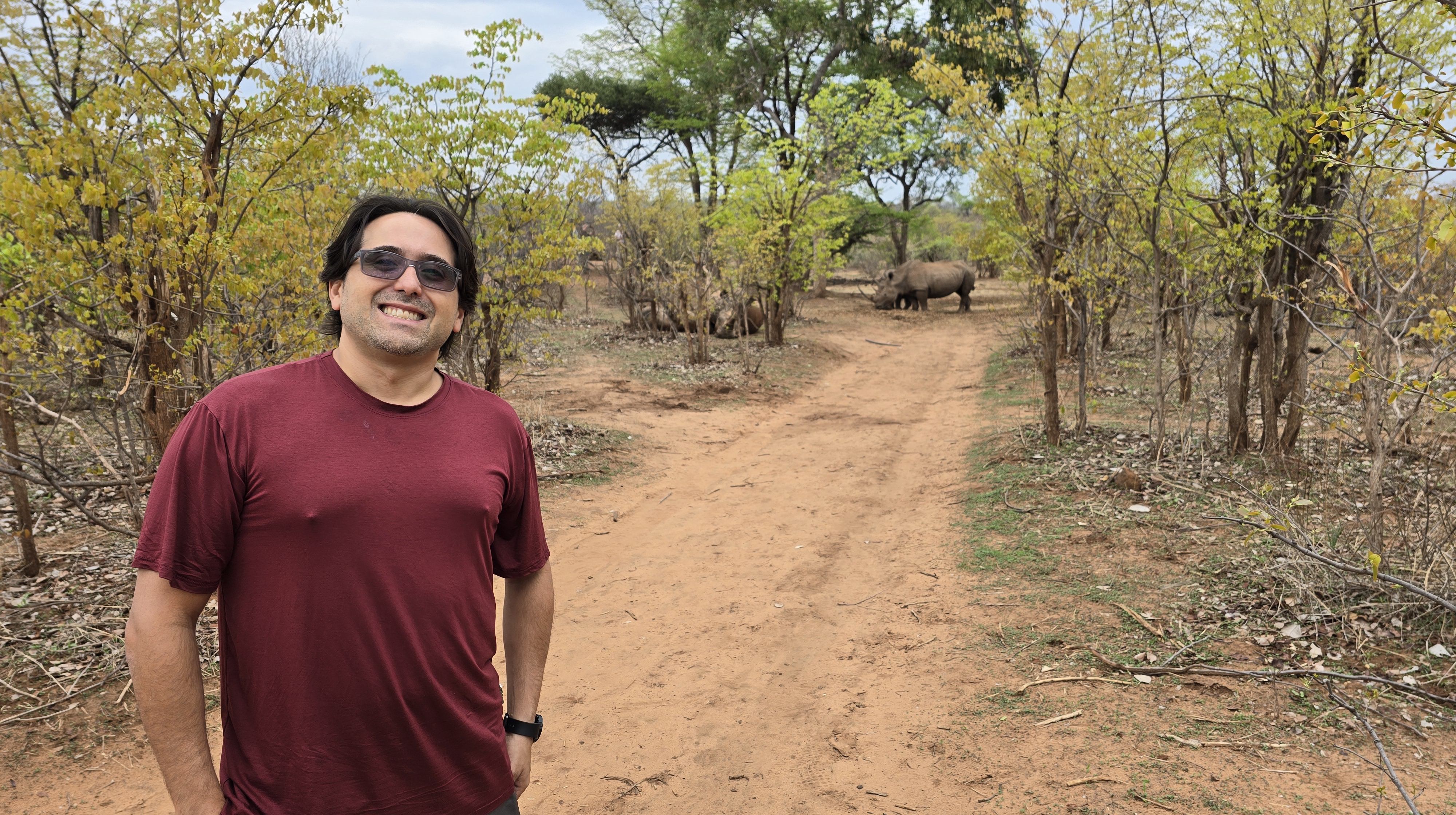As regras, claro, são rígidas: nada de correr, nada de flash, nada de fazer barulho. Não vai pagar uma de doido. Qualquer movimento brusco pode assustar o animal, e os guias repetem isso até cansar. Eles conhecem o comportamento dos bichos a ponto de identificar de longe quando um rinoceronte está calmo ou irritado. E os sinais são bem claros: orelhas mexendo rápido, pata batendo no chão, cabeça levantando de repente, às vezes o rinoceronte até dá um pinotinho só pra avisar que não está gostando da presença humana. A gente sempre caminha contra o vento, porque se o cheiro humano chegar neles, já era — o olfato deles é excelente, mas a visão é ruim. Também nunca ficamos de frente para o animal; sempre perpendiculares, dificultando que ele nos enxergue bem. Tudo é feito em silêncio absoluto, andando devagar, em fila, e só se aproximando quando o guia dá o sinal. Quando o guia fala “para”, é para parar mesmo. Os rinocerontes do parque são acostumados com humanos, então são mais tranquilos, mas nem por isso é lugar para bancar influenciador de TikTok e querer montar neles. Eles são monitorados 24h por GPS, e antes de entrar no parque o guarda já sabe exatamente onde estão — e fica lá esperando a gente com sua companheira inseparável, a AK-47.