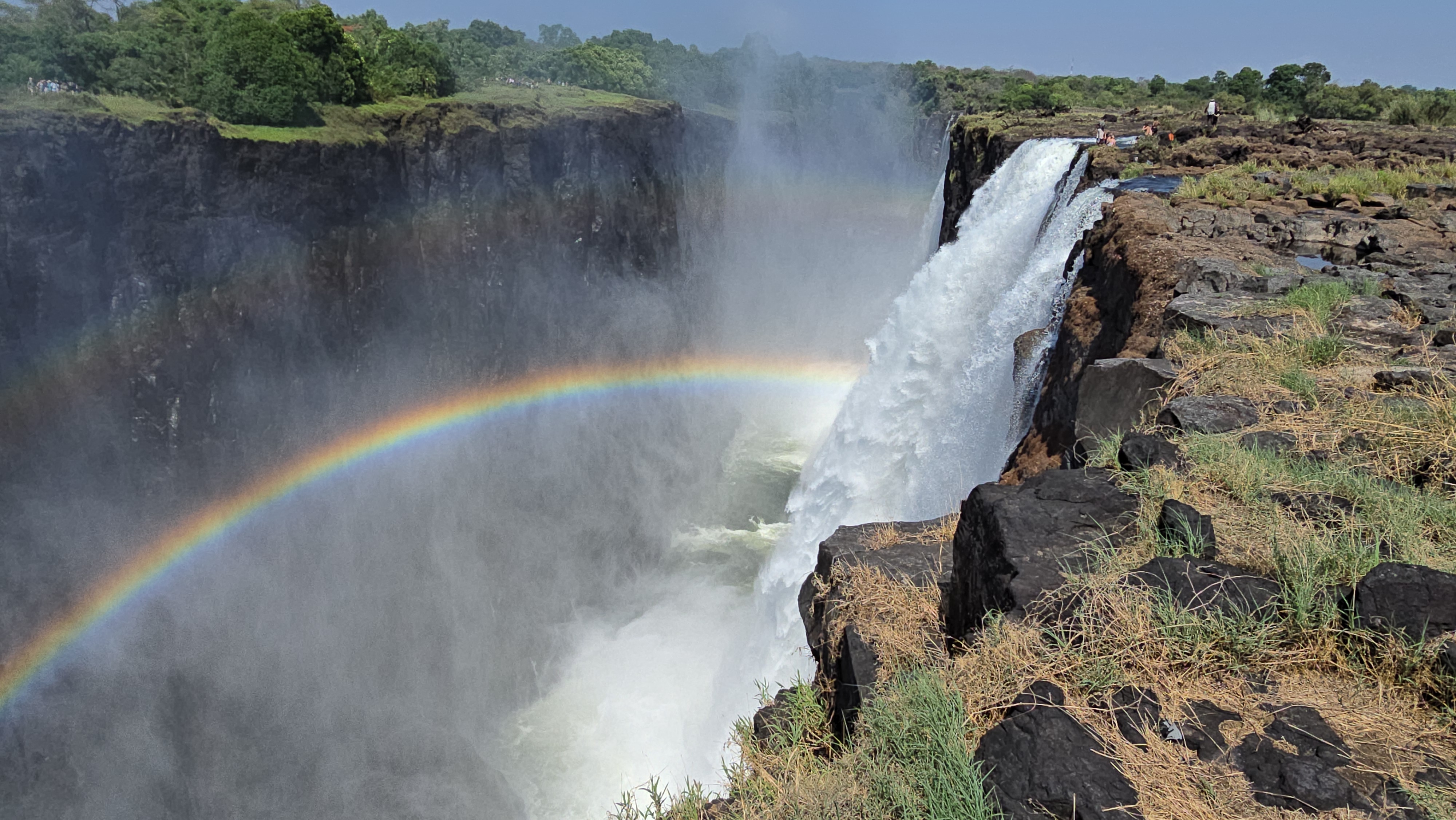 Sempre tive uma vontade enorme de conhecer as Cataratas Vitória, as Cataratas do Iguaçu versão “modo hard” africano. E realmente são absurdas: uma das maiores quedas d’água do planeta, dividida entre Zâmbia e Zimbábue. O rio Zambeze despenca mais de 100 metros e se estende por quase 1,7 km, formando uma parede contínua de água que os povos locais chamavam de Mosi-oa-Tunya — “a fumaça que troveja”. E o nome não é figura de linguagem, não: o barulho é de estremecer o peito, e a névoa sobe tanto que parece fumaça de incêndio. Pra você ter ideia, quando eu estava na fronteira, sem conseguir ver ou ouvir nada, falei pro guia: “nossa, tá chuviscando”. Ele respondeu: “não, isso é a névoa da cachoeira”. Eu estava a quilômetros de distância. A névoa já tava chegando antes de mim.