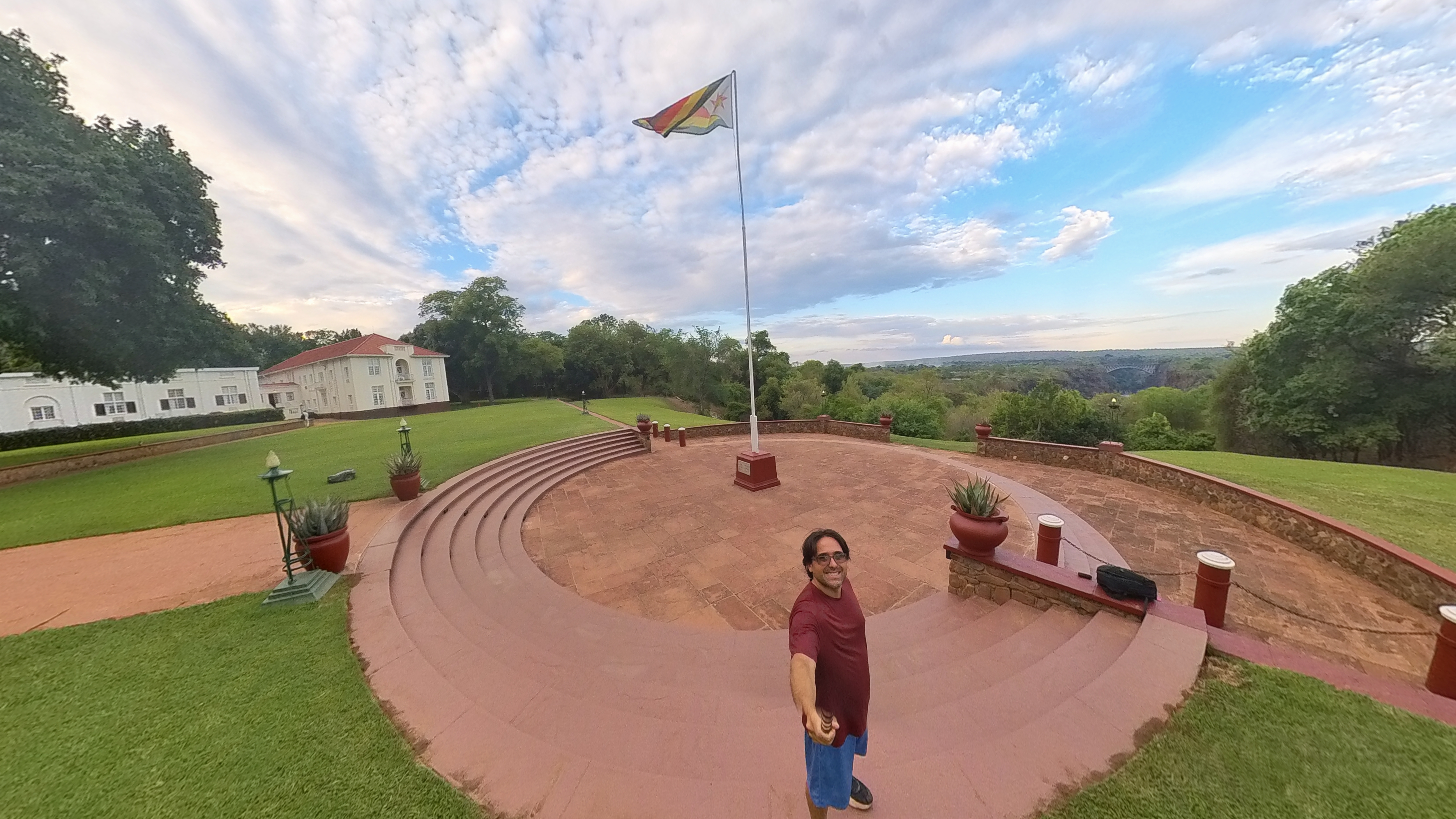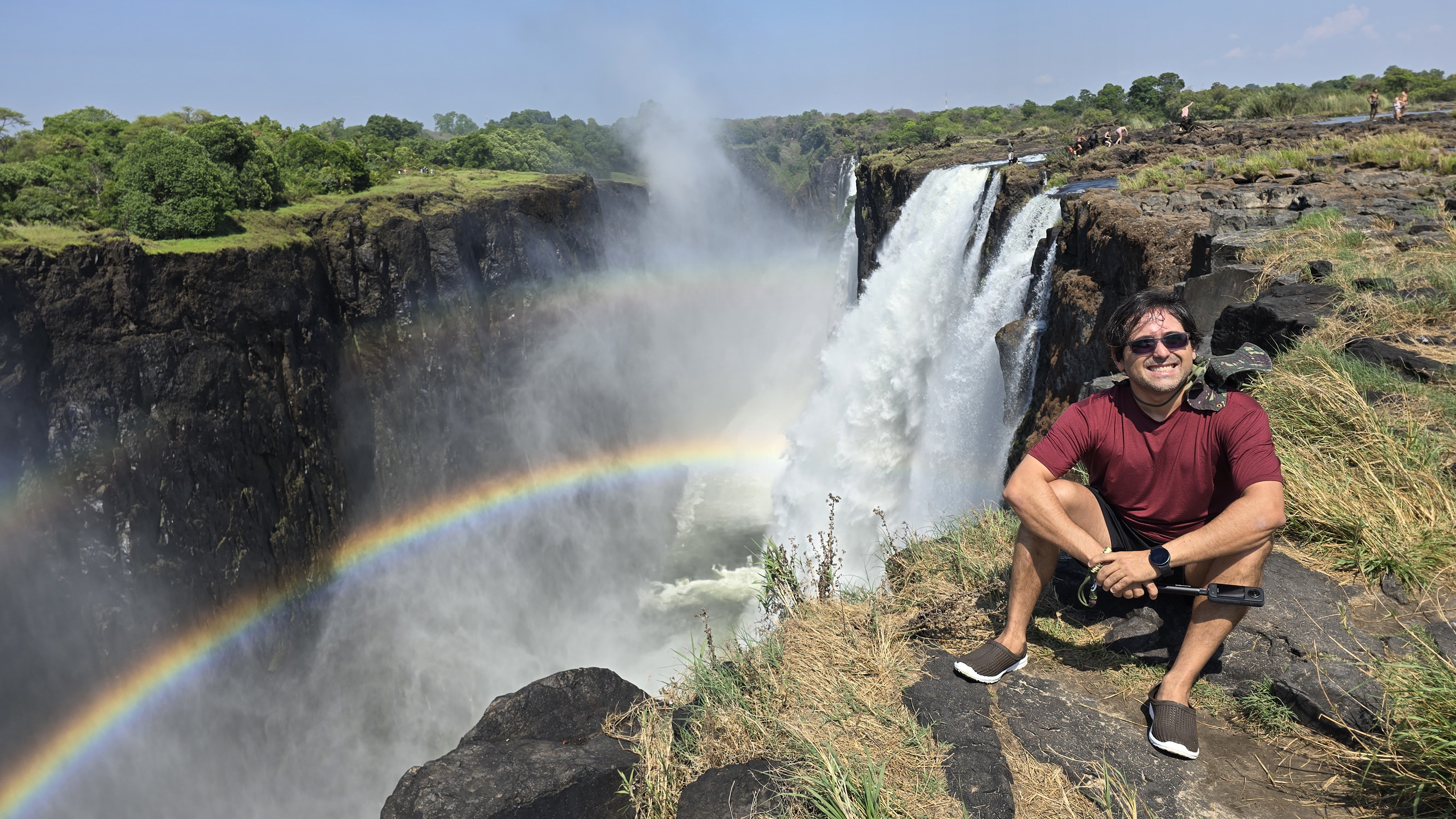Como as cataratas marcam a fronteira natural entre Zâmbia e Zimbábue, você pode escolher ficar em Livingstone ou em Victoria Falls. Eu fiquei do lado zambiano porque Livingstone é muito maior e tem bem mais infraestrutura — no Zimbábue, a cidade é pequena e tudo parece girar só em torno da cachoeira. Viajei em novembro, que é baixa temporada. Foi ótimo porque não tinha multidão, deu pra ir na Piscina do Diabo com tranquilidade (vou falar dela depois) e, de quebra, não peguei chuva em nenhum dia. Mas, ao mesmo tempo, dava até uma pena: eu pagava os passeios e ia sozinho em todos. A minivan de oito lugares chegava no Airbnb, ou então aqueles carros de safári com doze bancos, e… só eu. Até hoje não sei se eles realmente tiveram lucro comigo — talvez eu tenha sido o VIP involuntário da semana.