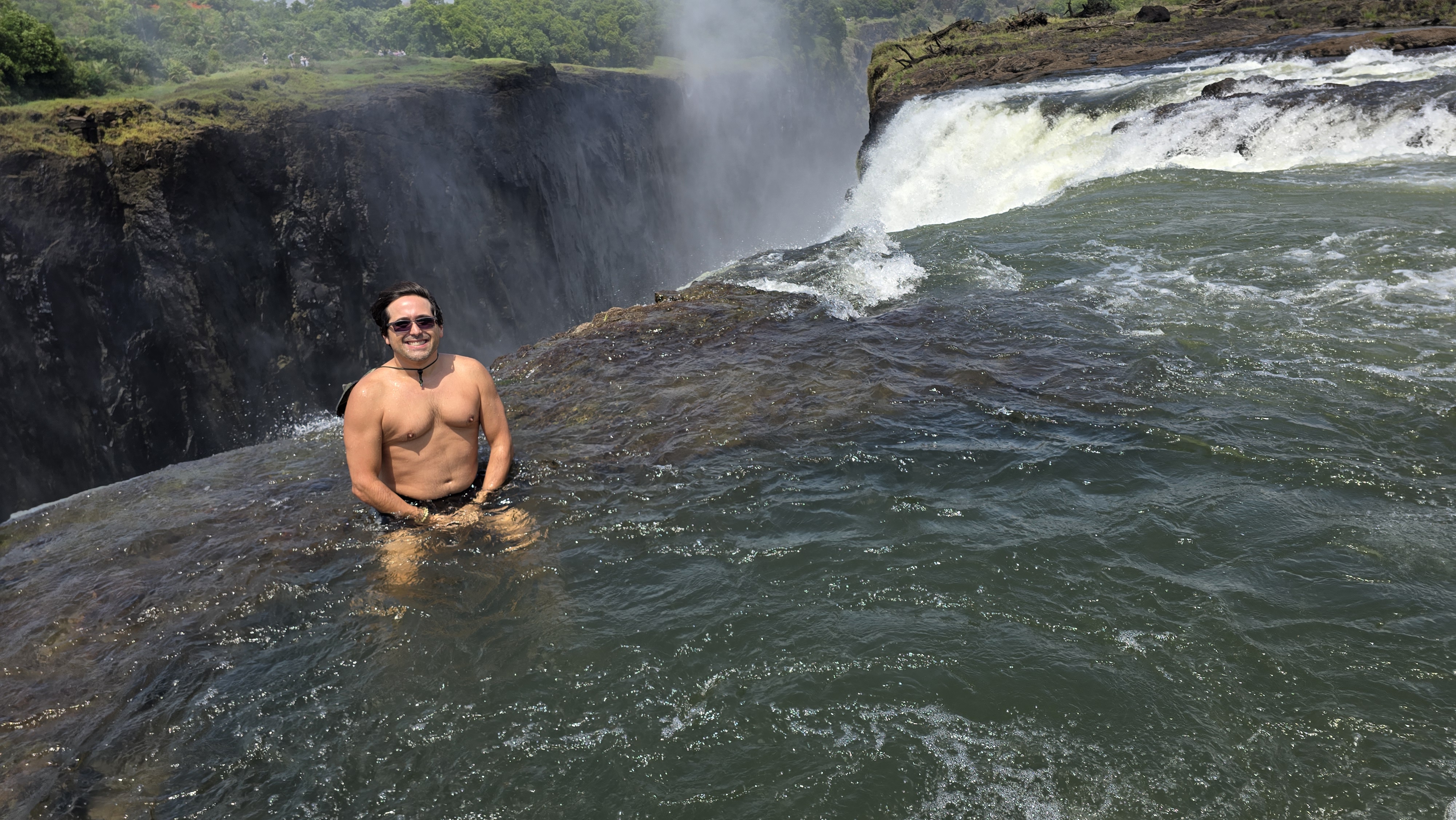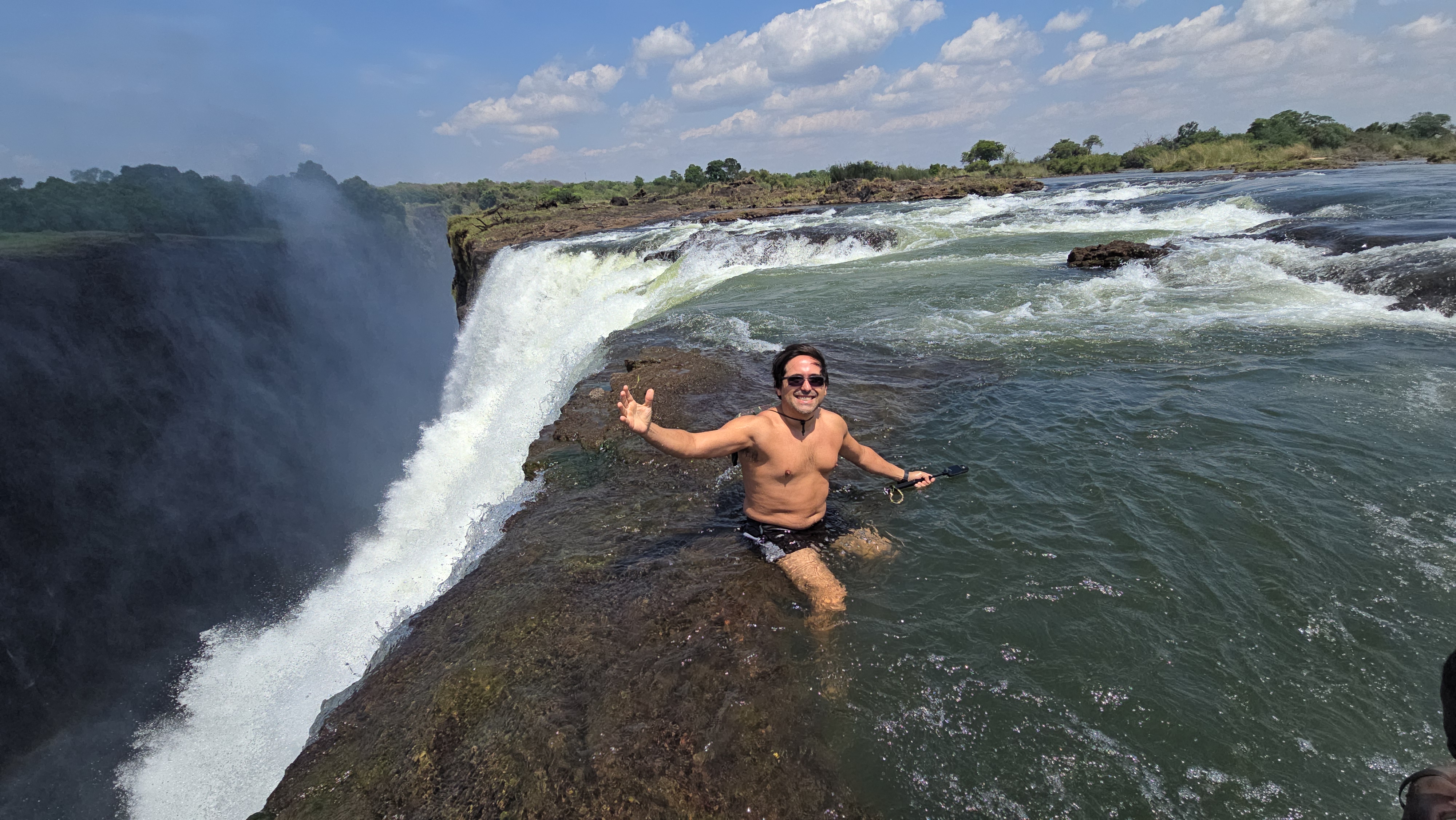 Então chegou a hora de visitar o principal motivo da minha viagem à Zâmbia: a famosa Piscina do Diabo. Sabe aquelas piscinas de borda infinita que o pessoal posta em Dubai pra tirar onda? É a mesma ideia — só que, em vez de um skyline, você tem uma queda de mais de 100 metros logo depois da borda. Sem exagero: é exatamente isso. A Piscina do Diabo é uma piscina natural formada bem na beira das Cataratas Vitória, do lado zambiano, e só dá pra visitar numa época específica do ano — entre agosto e dezembro, quando o rio Zambeze está mais baixo. Qualquer outra época é praticamente assinar o atestado de óbito. Na seca, as rochas criam uma barreira natural que segura uma parte da água, formando um ponto seguro onde dá pra nadar a centímetros do abismo. E quando digo “parte da água”, é parte mesmo — meio metro fora do local indicado e você vira o Pica-Pau despencando catarata abaixo. Eu via fotos na internet e jurava que tinha um truquezinho, um parapeito escondido. Cara… não tem truque. É um murinho natural de pedra, você sentado e o abismo te olhando de volta.