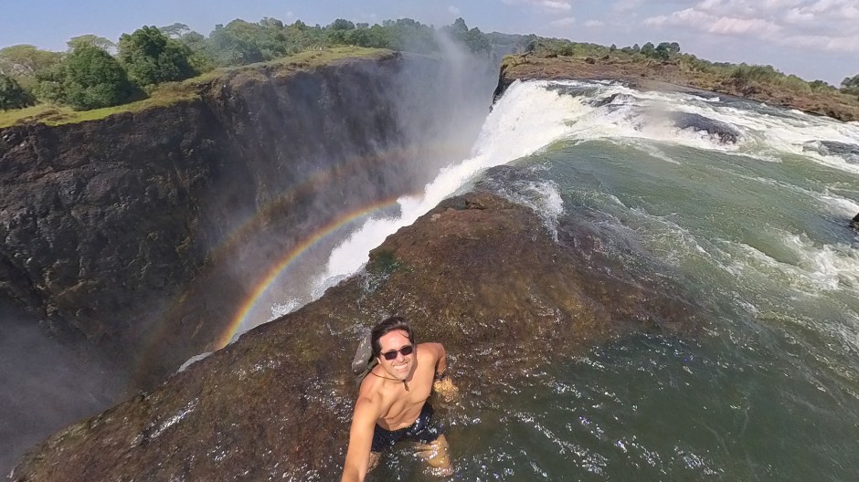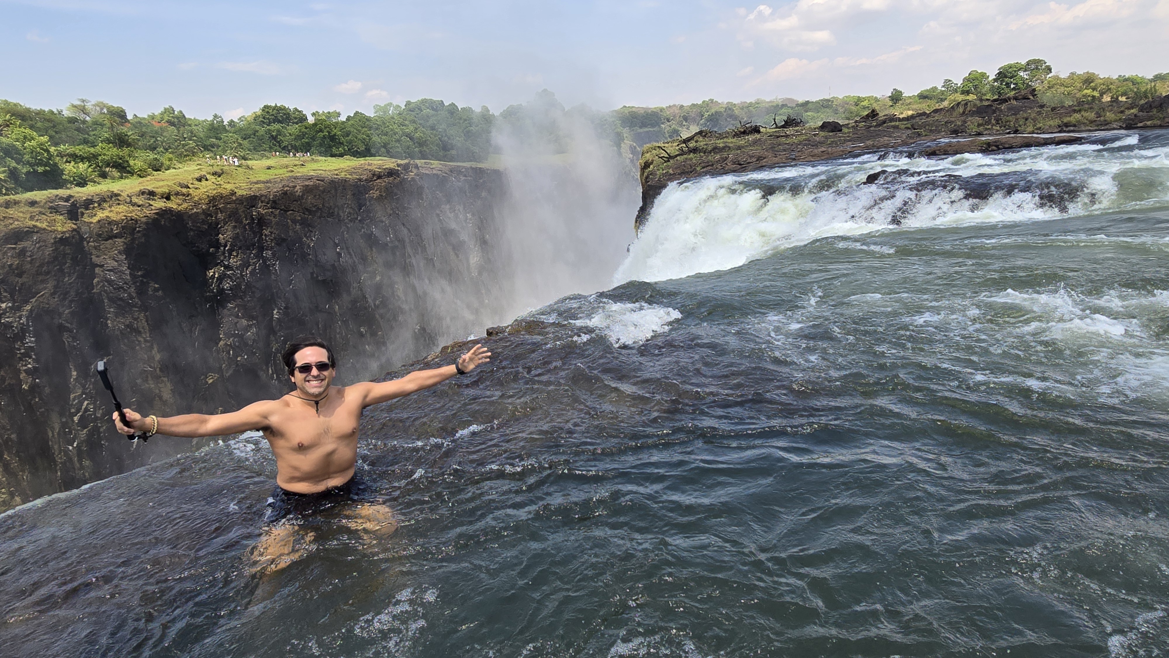 Chegando na ilha, o guia dá as instruções — nada de pular, correr ou inventar moda. Incrível que, seja rinoceronte, seja hipopótamo, ou seja piscina suicida, as regras são sempre as mesmas, é só não pagar de doido. Descemos do barco e seguimos caminhando até a piscina. No caminho, já começam as fotos com o precipício a centímetros dos seus pés. JURO. É você andando ali e percebendo que um passo errado significa cancelar o CPF. Ou o passaporte, no caso. É o cenário perfeito do “fulano caiu tentando tirar a melhor selfie”. E, olha, teve momentos em que bateu um medo sincero disso acontecer comigo. Às vezes você vai bater uma foto, o sol te cega, o vento te empurra, e a borda tá ali, firme e forte, te lembrando que a vida é frágil.