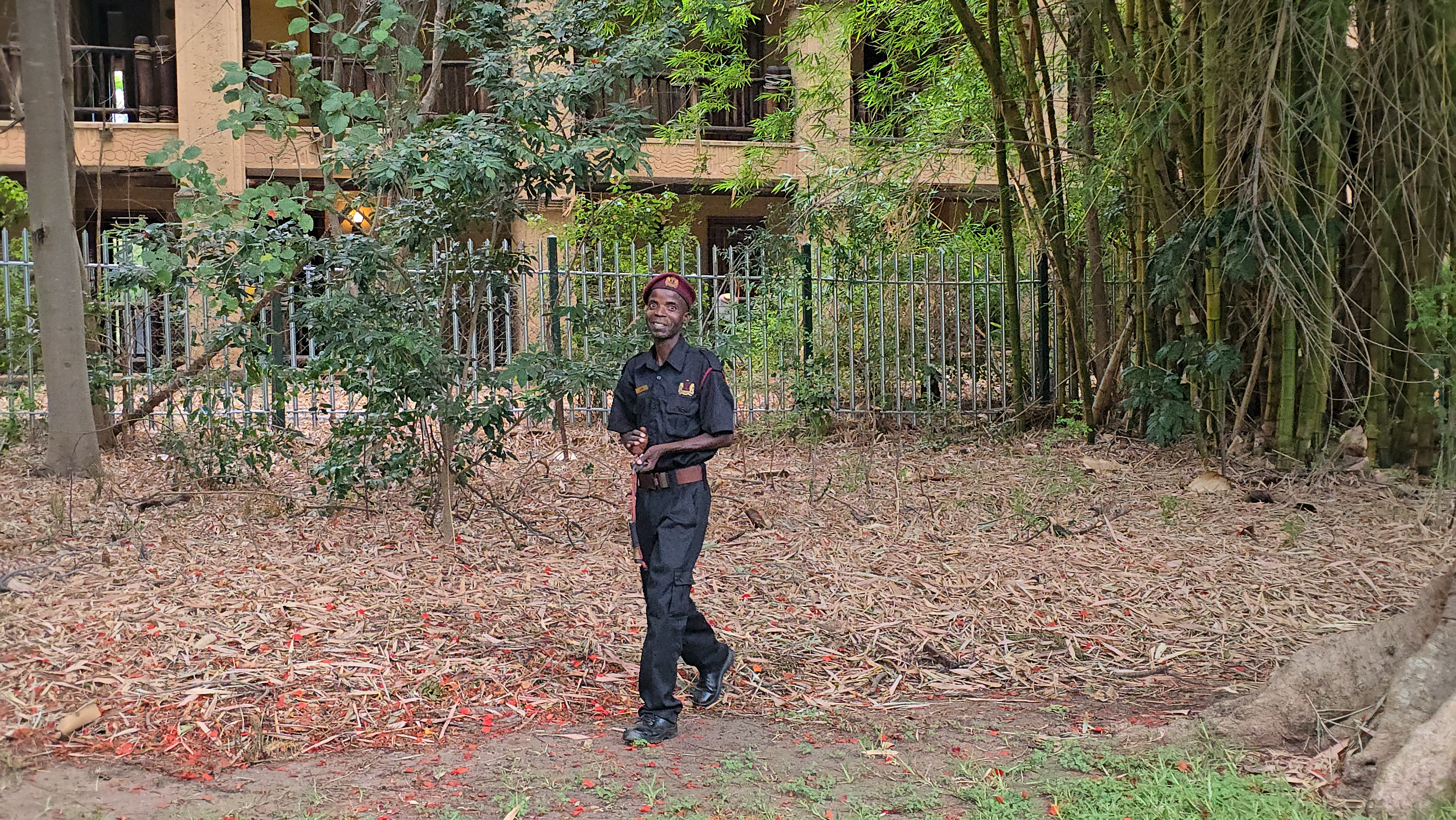 As regras, claro, são rígidas: nada de correr, nada de flash, nada de fazer barulho. Não vai pagar uma de doido. Qualquer movimento brusco pode assustar o animal, e os guias repetem isso até cansar. Eles conhecem o comportamento dos bichos a ponto de identificar de longe quando um rinoceronte está calmo ou irritado. E os sinais são bem claros: orelhas mexendo rápido, pata batendo no chão, cabeça levantando de repente, às vezes o rinoceronte até dá um pinotinho só pra avisar que não está gostando da presença humana. A gente sempre caminha contra o vento, porque se o cheiro humano chegar neles, já era — o olfato deles é excelente, mas a visão é ruim. Também nunca ficamos de frente para o animal; sempre perpendiculares, dificultando que ele nos enxergue bem. Tudo é feito em silêncio absoluto, andando devagar, em fila, e só se aproximando quando o guia dá o sinal. Quando o guia fala “para”, é para parar mesmo. Os rinocerontes do parque são acostumados com humanos, então são mais tranquilos, mas nem por isso é lugar para bancar influenciador de TikTok e querer montar neles. Eles são monitorados 24h por GPS, e antes de entrar no parque o guarda já sabe exatamente onde estão — e fica lá esperando a gente com sua companheira inseparável, a AK-47.