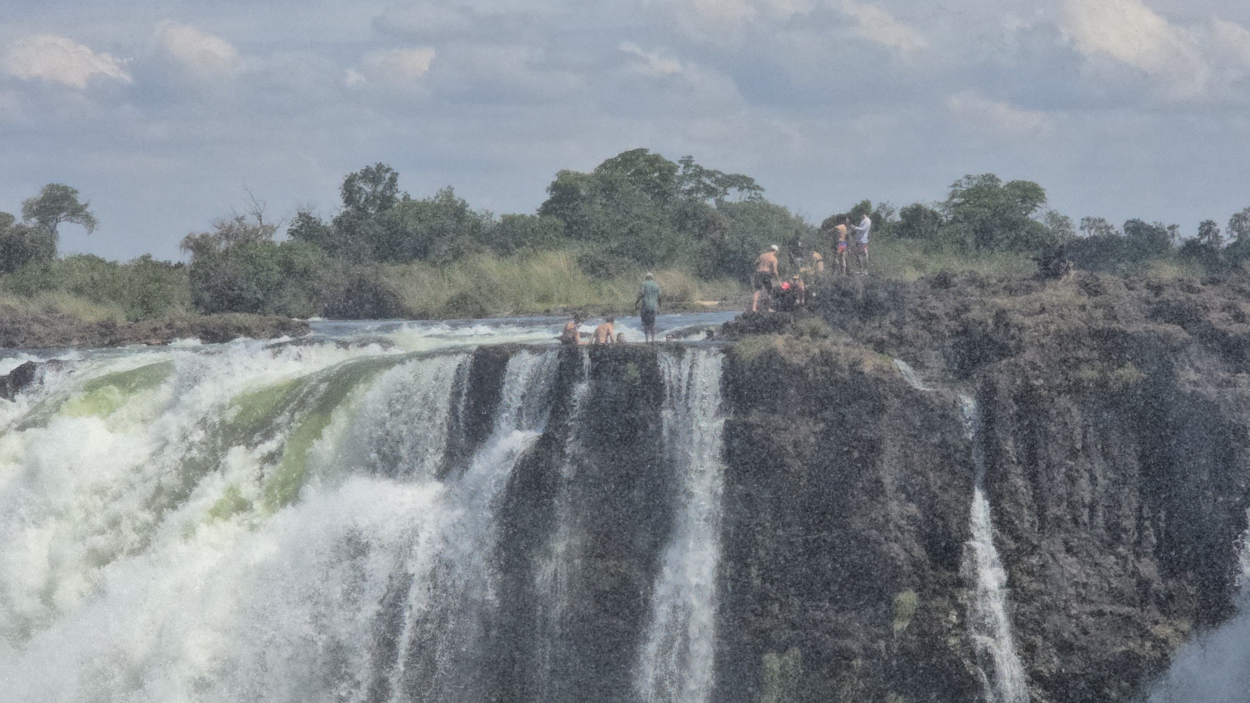 Chegando na ilha, o guia dá as instruções — nada de pular, correr ou inventar moda. Incrível que, seja rinoceronte, seja hipopótamo, ou seja piscina suicida, as regras são sempre as mesmas, é só não pagar de doido. Descemos do barco e seguimos caminhando até a piscina. No caminho, já começam as fotos com o precipício a centímetros dos seus pés. JURO. É você andando ali e percebendo que um passo errado significa cancelar o CPF. Ou o passaporte, no caso. É o cenário perfeito do “fulano caiu tentando tirar a melhor selfie”. E, olha, teve momentos em que bateu um medo sincero disso acontecer comigo. Às vezes você vai bater uma foto, o sol te cega, o vento te empurra, e a borda tá ali, firme e forte, te lembrando que a vida é frágil.