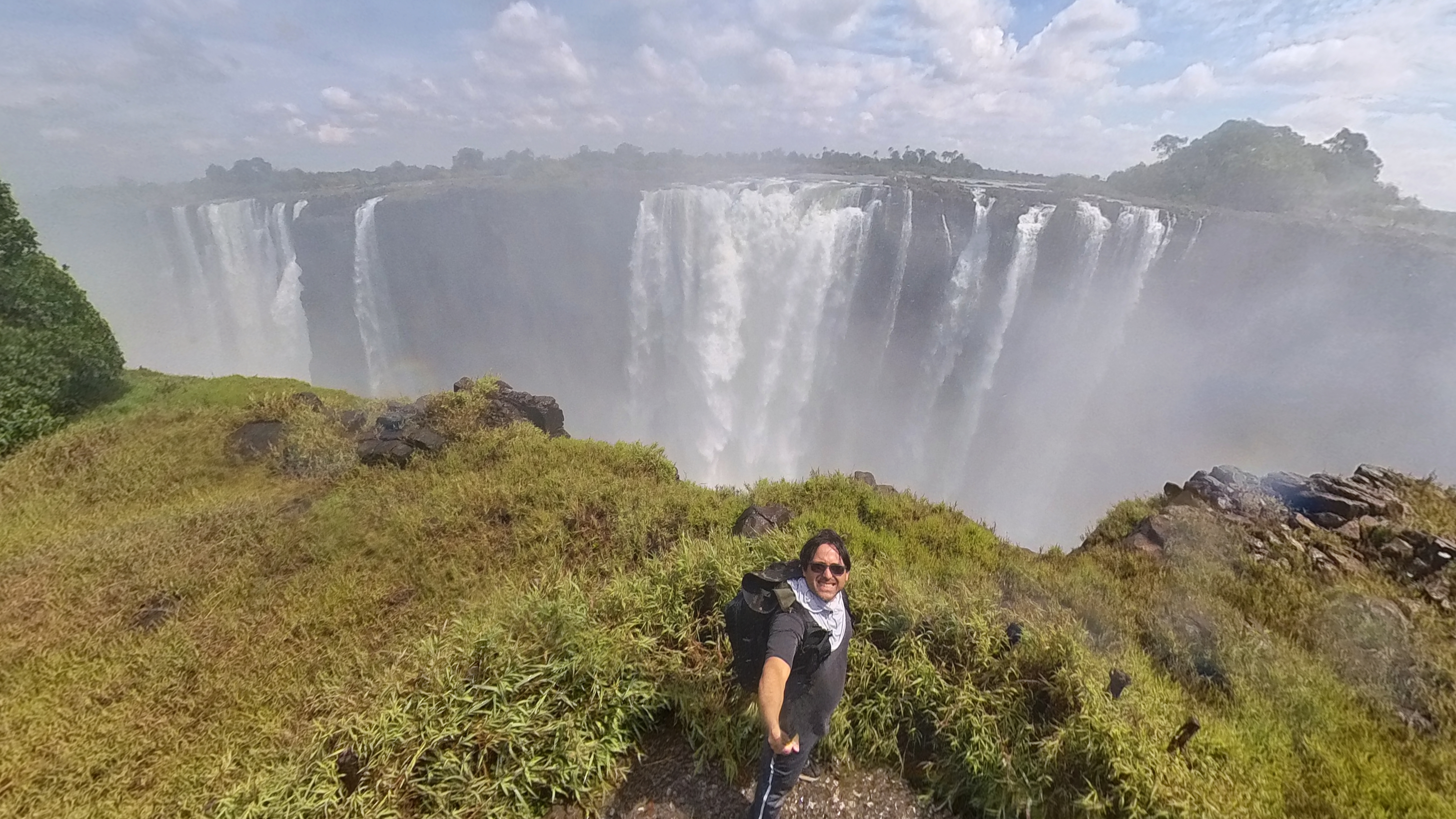 Como as cataratas marcam a fronteira natural entre Zâmbia e Zimbábue, você pode escolher ficar em Livingstone ou em Victoria Falls. Eu fiquei do lado zambiano porque Livingstone é muito maior e tem bem mais infraestrutura — no Zimbábue, a cidade é pequena e tudo parece girar só em torno da cachoeira. Viajei em novembro, que é baixa temporada. Foi ótimo porque não tinha multidão, deu pra ir na Piscina do Diabo com tranquilidade (vou falar dela depois) e, de quebra, não peguei chuva em nenhum dia. Mas, ao mesmo tempo, dava até uma pena: eu pagava os passeios e ia sozinho em todos. A minivan de oito lugares chegava no Airbnb, ou então aqueles carros de safári com doze bancos, e… só eu. Até hoje não sei se eles realmente tiveram lucro comigo — talvez eu tenha sido o VIP involuntário da semana.