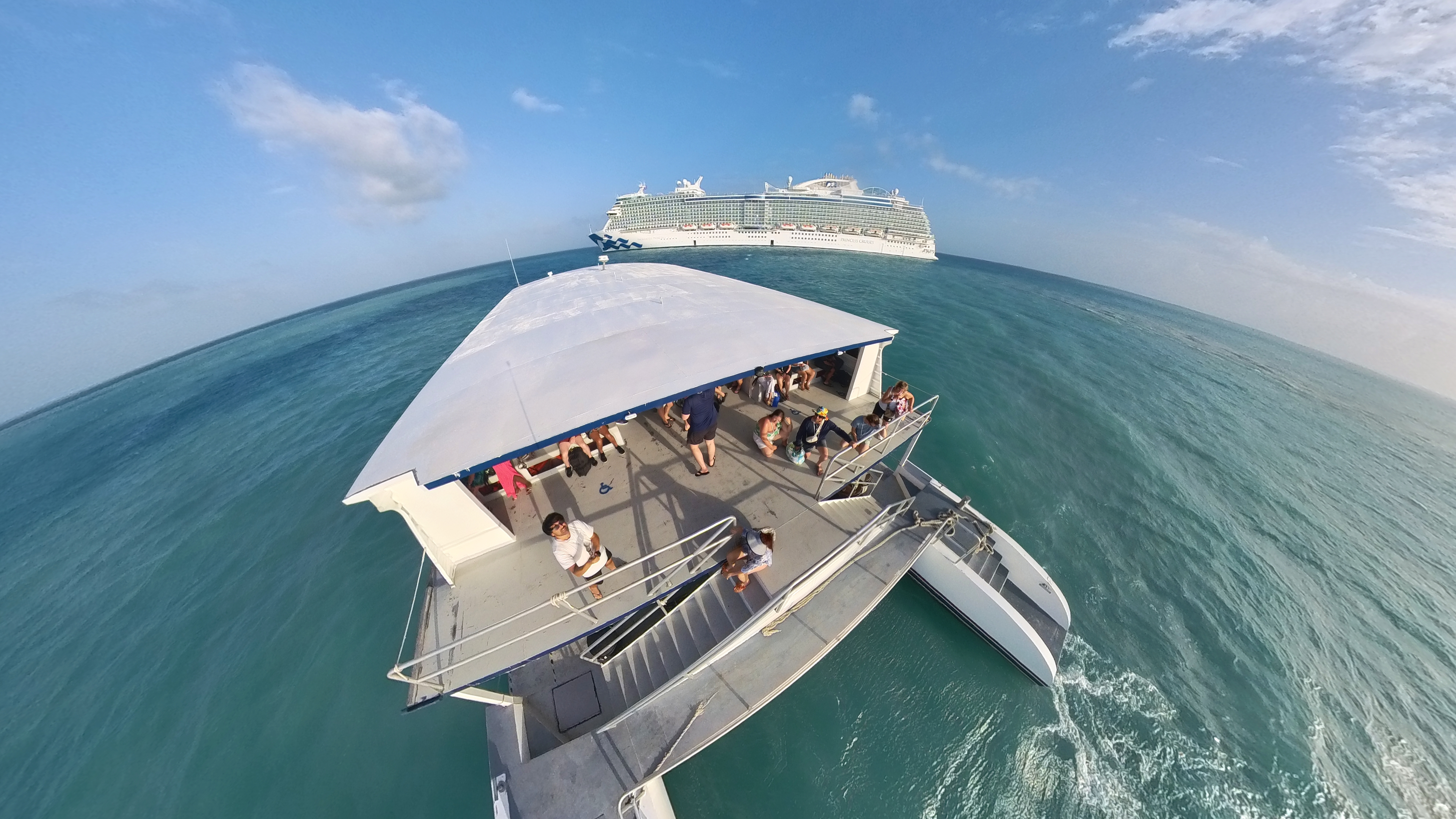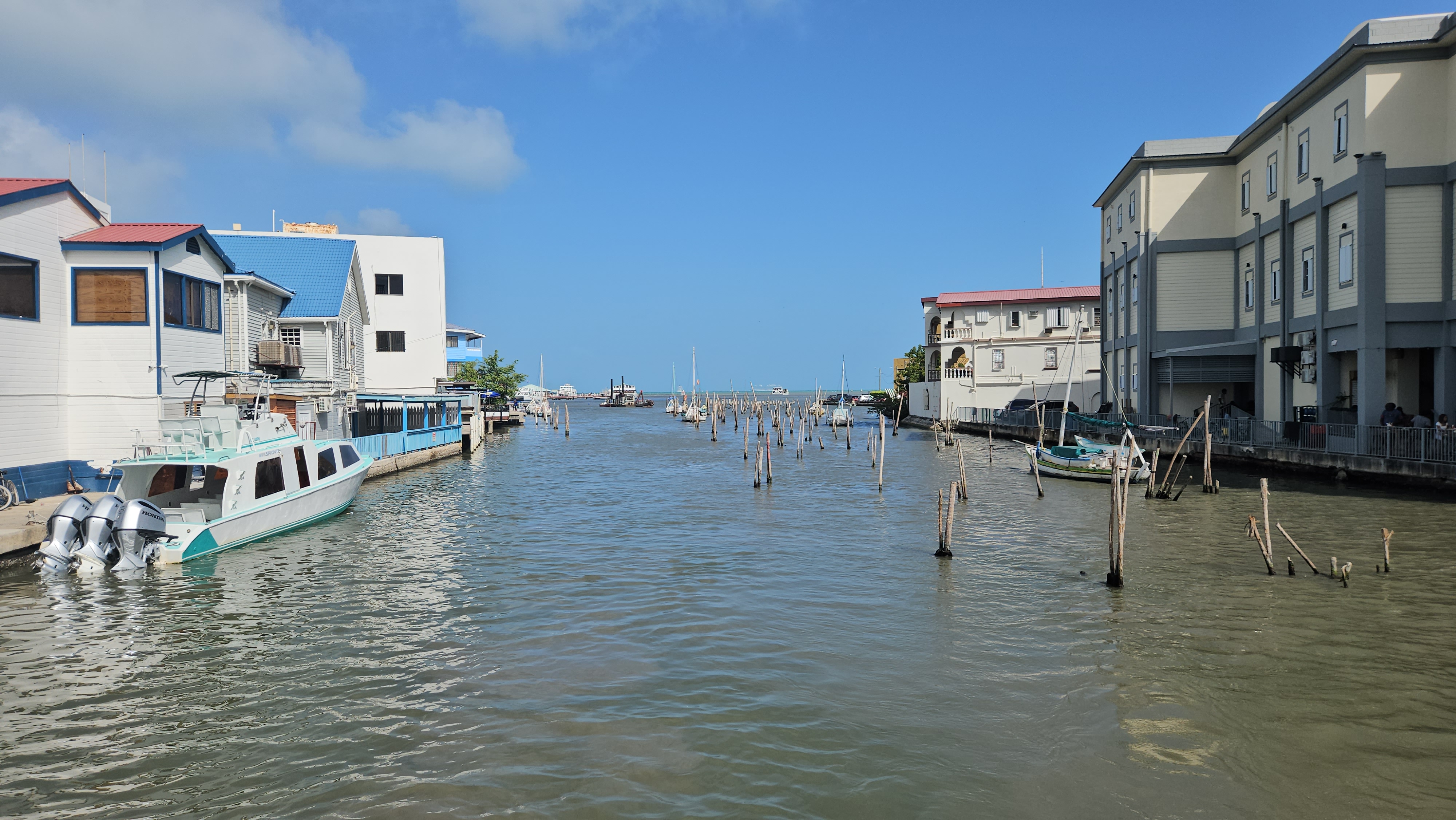 Isso acontece porque o litoral de Belize, especialmente na região da capital, é raso e protegido por uma extensa barreira de corais — a segunda maior do mundo como já falei. Essa formação natural, embora seja ótima para preservar a biodiversidade marinha e proporcionar águas calmas e cristalinas, torna impossível que navios de grande porte se aproximem da costa sem risco de encalhar. Não existe um porto com profundidade suficiente para receber cruzeiros diretamente, então a solução é o chamado “tender service”: os navios de cruzeiro ficam fundeados em alto-mar, e pequenos barcos fazem o translado dos passageiros até a terra firme.