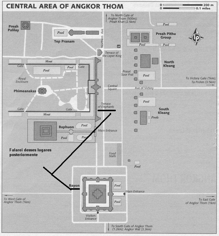 Dentro de Angkor Thom há um longo terraço de 350 metros conhecido como o Terraço dos Elefantes. Ele era utilizado para demonstrações públicas e também como base para o rei em cerimônia. Eu fiquei por uns momentos sentado lá e imaginando o rei no meio e as suas diversas divisões de cavalos, elefantes e infantaria. Devia ser algo impressionante, cara!Complexo de Angkor no Camboja