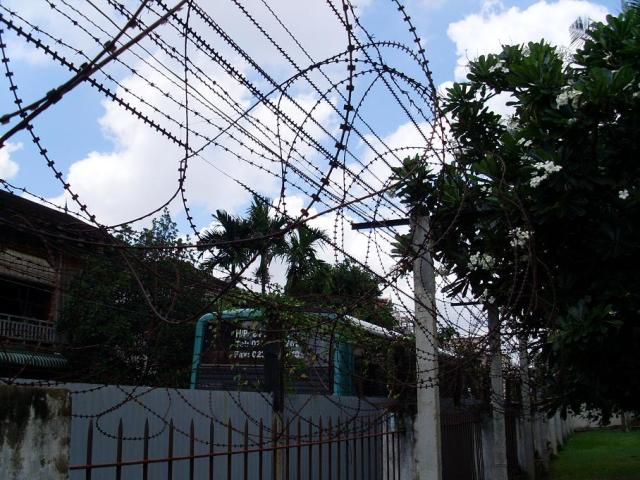 Estas cercas de arames farpados ficavam no terceiro andar da escola. Elas serviam para prevenir que detentos desesperados tentassem se matar atirando-se do terceiro andar e assim morressem sem “confessar”.Por último eu vi a entrevista de um cara que foi torturado em S-21 também. Esse cara foi um dos que mais me marcou. Mexendo pelos arquivos que sobraram de S-21, os produtores conseguiram achar a transcrição do depoimento dele. O produtor vai e pergunta como o cidadão pode ter entregado mais de quarenta pessoas. O cara com lágrimas nos olhos, responde que no momento em que estava sendo torturado, no desespero para que tudo cessasse, decidiu “cooperar” e saiu falando o nome de todas as pessoas que vinham a sua cabeça, fossem seus vizinhos, fossem seus amigos. O produtor fica indignado e pergunta se todas as pessoas que fossem torturadas fizessem o mesmo, quantas pessoas iriam restar no Camboja. O cara simplesmente baixa a cabeça, começa a chorar e fala algo que seria muito, mas MUITO engraçado se não fosse trágico. Antes do interrogatório, na sessão inicial de torturas, eles tinham que escolher dentre quatro opções pra qual daquelas eles haviam trabalhado. Eu não lembro as quatro, mas duas eram CIA, “serviço secreto vietnamita” e uma outra, se não me engano, KGB. Agora o detalhe é que ele não sabia que diabos era nenhum dos quatros e o torturador provavelmente também nem fazia idéia (lembrar que o torturador era um adolescente). Mas depois de tanto levar porrada, ele resolveu falar que era da CIA pra ver se tudo acabava logo. Dá pra acreditar nisso?