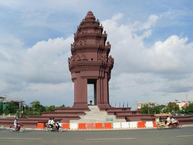 Monumento à independência no centro de Phnom Penh. As suas curvas são inspiradas nos monumentos em Angkor que depois vou explicar melhor o que é.