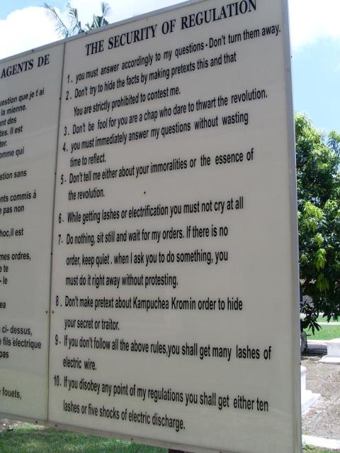Regras de conduta da S-21. Achei uma traducao pela internet: 1) Você deve responder de acordo com minhas perguntas – Não se vire/2) Não tente esconder os fatos criando pretextos para isso ou aquilo. Você está estritamente proibido em me contestar./3) Não seja tolo ou você será um capítulo que se atreve a contrariar a revolução/4) Você deve responder imediatamente minhas perguntas sem desperdiçar tempo em reflexão/5) Não me diga nada sobre suas imoralidades ou a essência da revolução/6) Se você receber chicotadas ou choques elétricos você não deve chorar/7) Não faça nada, sente-se e aguarde pelas minhas ordens. Se não existirem ordens, mantenha-se quieto. Quando eu perguntar alguma coisa para você, você deve responder imediatamente sem protestar/8 ) Não arrume pretextos sobre a ordem do Kromin Kampuchea para esconder seu segredo ou traidor/9) Se você não seguir as regras acima, você irá receber vários choques elétricos/10) Se você desobedecer qualquer ponto deste regulamento você irá receber dez chicotadas ou cinco choques elétricos.
