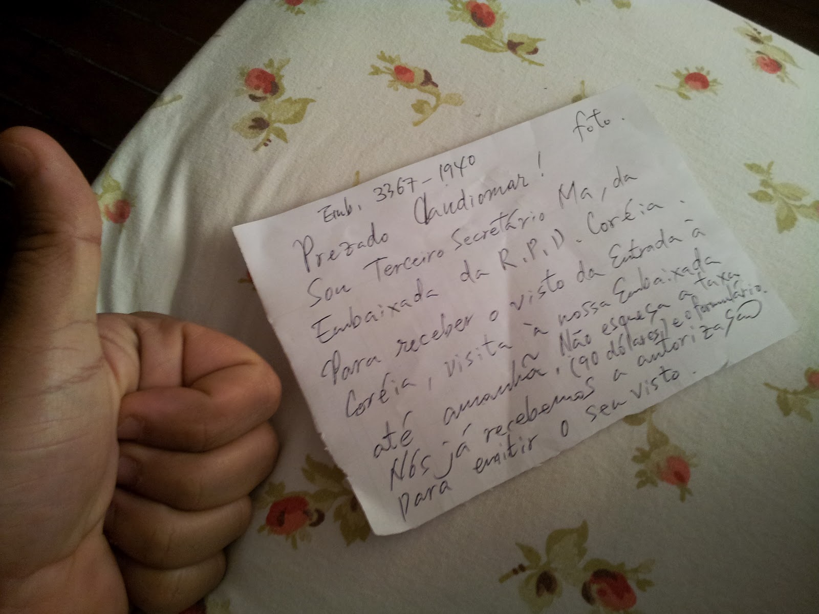 Outra historia engraçada acerca desse visto foi que eu liguei na embaixada da Coréia do Norte e falei que eu tinha uma autorização de Pyongyang para poder ter um visto de turista emitido na embaixada de Brasília. Os caras ficaram de checar e, quando eu chego em casa, escuto o meu porteiro falar que um cara falando um português meio estranho chegou lá portaria e tava procurando um tal de um “sr. Claudiomar” sobre um visto para a Coréia. O porteiro falou que eu não estava (pô, tava no trabalho!), mas o cara não parava de insistir que precisa ir no meu apartamento. Mas queria porque queria de qualquer jeito. Depois de muita luta, ele se contentou em me deixar um bilhete, o bilhete abaixo!