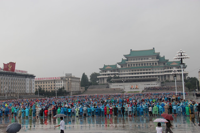 Milhares e milhares de crianças ensaiando NA CHUVA para mais uma das dezenas de demonstrações que ocorrem todos os anos na Coréia do Norte para demonstrar o quanto eles são um país feliz. Esses ensaios ocorrem três vezes por semanas e levam entre duas e três horas. Assim como essas crianças estavam na chuva, poderiam estar sob o sol ou sob a neve! Isso tudo para demonstrar a felicidade no reino mágico de Kim Il Sung! A vida é dura, amigo!