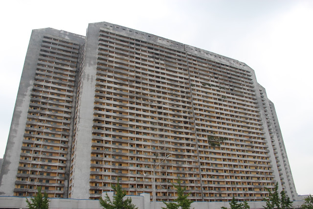 Hotel Ryugyong. Arranha-céu que se destaca no meio de Pyongyang. Quando iniciaram as suas obras, era para ser a maior construção do mundo. Vinte anos depois, ele ainda não está construído. Estudiosos sugerem que ele chegou a sugar 3% do PIB coreano por ano para sua construção. Por isso suas obras encontram-se paralisadas.