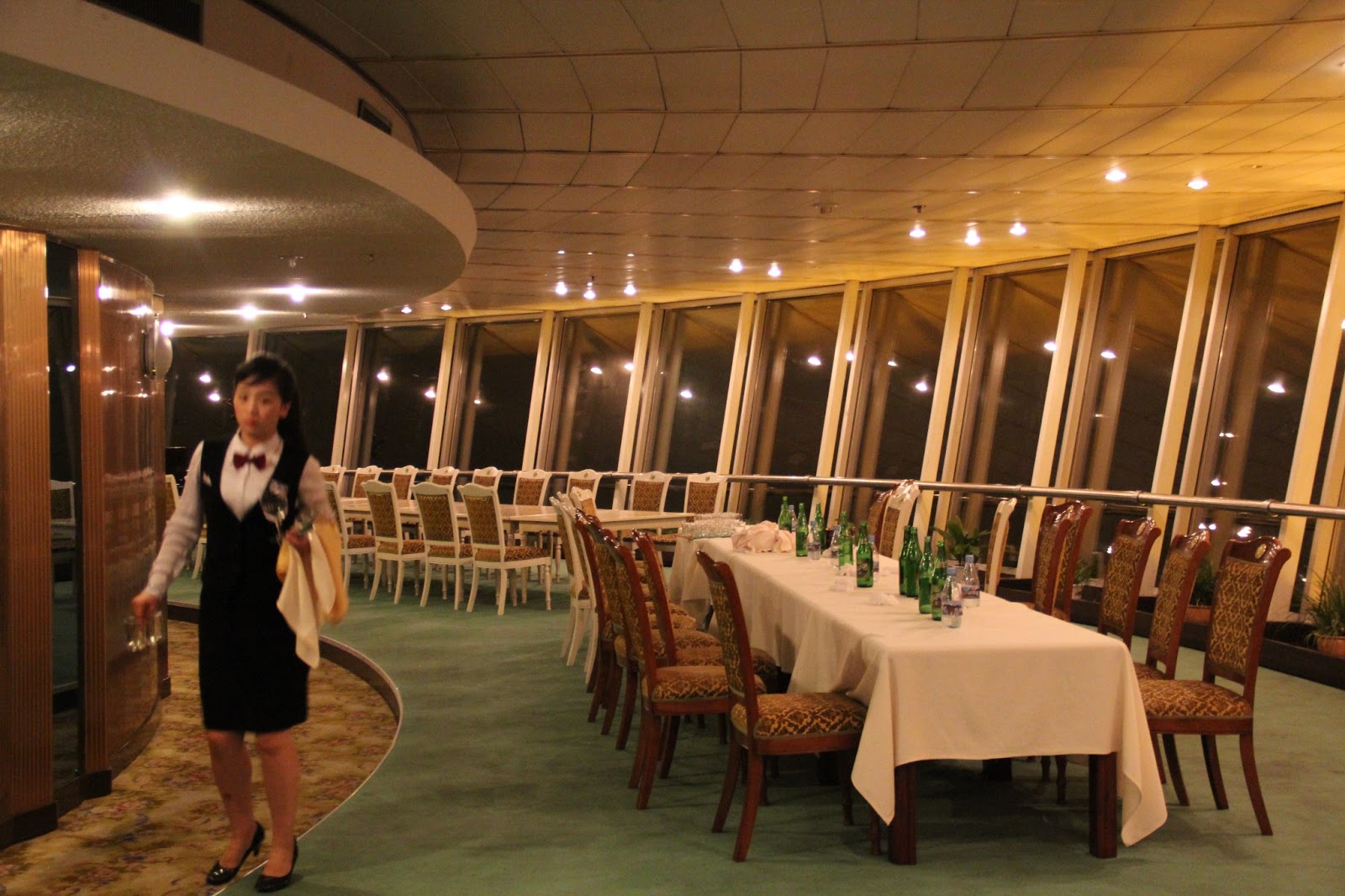 Mas como qualquer coisa que seja idiota torna-se super da hora quando se trata de Coréia do Norte e como já estava incluso no pacote, fomos para lá. Basicamente a mesma estrutura de qualquer restaurante giratório, um haste central fixa com um anel ao redor que fica rodando junto com as mesas. Você fica lá sentado e chão rodando com você comendo em cima. Eu particularmente fiquei meio que enjoado por estar comendo e girando ao mesmo tempo, mas valeu pela experiência. Não sei se voltaria a outro restaurante giratório que continuei achando uma babaquice.