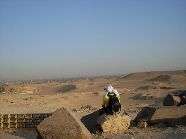 Desci na estação do metrô e, segundo orientação do meu livro, eu deveria pegar um táxi e pedir pra ele me levar às pirâmides. Saí da estação e o primeiro táxi que eu achei eu fui entrando e gesticulando que queria ir até as pirâmides. Do nada entrou um outro cara dentro do carro, falando um inglês perfeito e com uma idade semelhante a minha. Ele falou que morava em Alexandria e também estava indo pras pirâmides, perguntou se eu não queria rachar um táxi com ele. Como ele falava um inglês legal, era árabe e, by the way, já tava lá dentro do táxi mesmo, pensei que seria uma boa idéia que ele me acompanhasse. No caminho o taxista começou a falar com ele e ele foi me traduzindo: