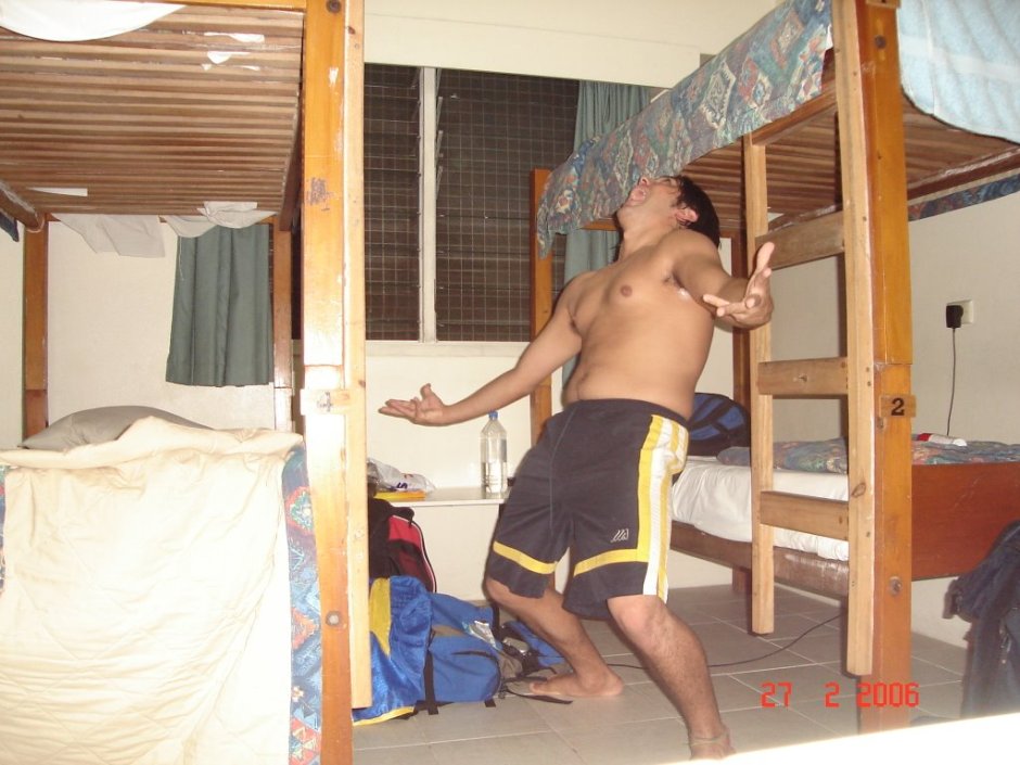 Caraca, na hora eu fiquei foi com medo!! Só pedi meia hora e ainda assim com aquela pena de gastar, deus me livre. Volto pro quarto e encontro só uma das cinco inglesinhas do quarto. Ela tava de toalha indo tomar banho. Troquei uma idéia com ela e quando ela foi pro banho eu comecei a pensar: “rapaz, eu vou dar um jeito de ficar inchado pra poder chamar a atenção da mulher”, comecei a pensar o que fazer. Tive a idéia perfeita: “Por que não fazer algumas flexões?”. Ranquei a camisa e comecei a pagar flexões no chão. Eu só tava era preocupado com alguma outra inglesa abrir a porta e dar de cara com aquela cena ridícula, um frigobarzinho com os pés apoiados na cama e fazendo flexão de braço. Mas graças a deus ninguém apareceu. Rapaz, eu acho que eu fiz umas 100 ou 150 flexões alternadas com séries de 15 repetições, sem brincadeira. Quando ela veio eu tava mais inchado que sapo cururu têitêi, foi muito engraçado, eu virei pra ela e perguntei: “E aí, cê vai fazer o que agora?”, ela só respondeu: “Dormir” e me deixou sozinho. E lá foi eu dormir que nem um bobo, mas claro, um bobo todo inchado.. uhaeuhaeuheauhae