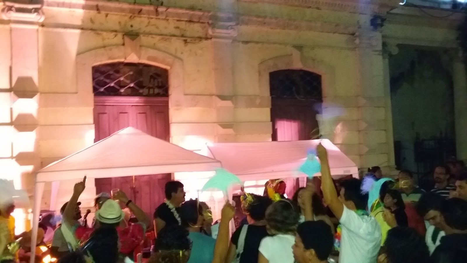 Porém, o que eu mais gostei passeando por Belém foi ter tido uma surpresa próximo ao teatro de Belém. Perambulando por lá, resolvi parar em um barzinho para tomar uma! Cadeira no meio da praça, hippies vendendo a arte, bêbados maltrapilhos dormindo nos bancos, mendigos por todos os lados, enfim, aquele paraíso para se tomar um chopp e descansar um pouco do mormaço. Cerveja Cerpa no copo e suor descendo pelas costas, noto, de repente, uma movimentação. Era um bloco de pré-carnaval! Éguas! Havia esquecido! Estávamos próximo do carnaval!