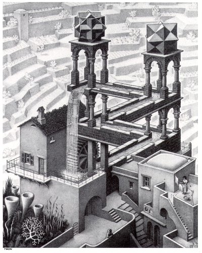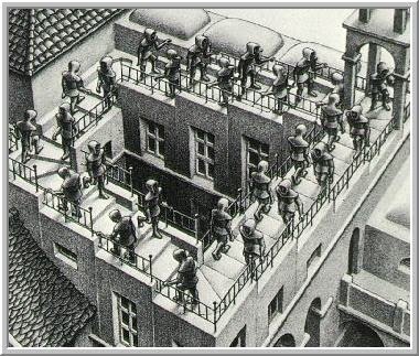Algumas das figuras impossíveis de Escher. Tente seguir o curso da água ou ver quem está subindo e quem está descendo na foto acima.