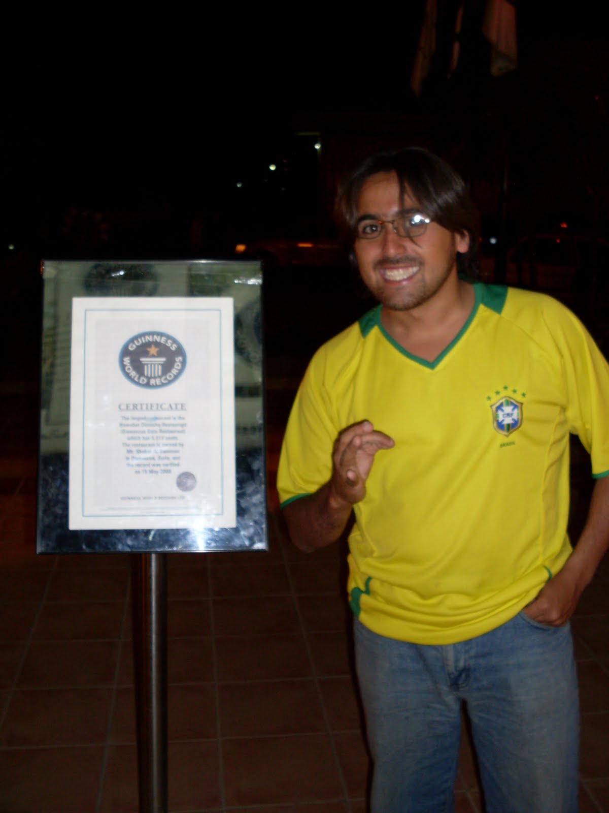 Mas a hora que eu mais esperava estava pra chegar. Estava pra ficar de noite. De noite? Pegar balada? Não! O Matt havia me prometido que de noite iríamos para o MAIOR RESTAURANTE DO MUNDO!! Huá Huá Huá (risadas maquiavélicas). Ãhn? Como assim? Que pegadinha é essa? Não, sério! Tou falando sério! O maior restaurante do mundo fica na Síria, não sabia não? Pois é, eu havia lido isso na BBC Brasil um ano antes de começar a viajar e fiquei com isso na cabeça durante um bom tempo!! Sim, cara! Na entrada tem um certificado do Guiness Book e tudo!