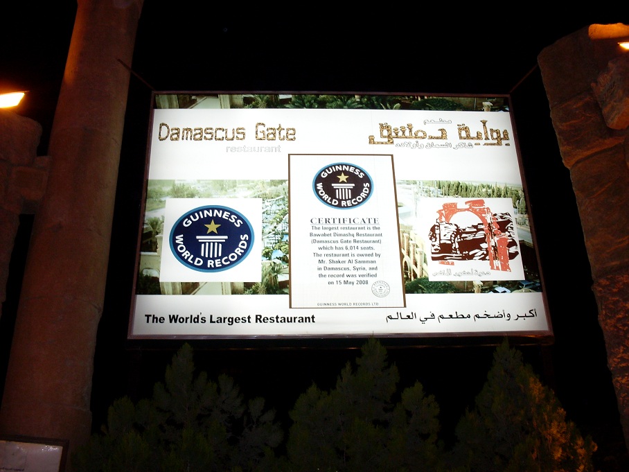O Damascus Gate conquistou o título que pertencia a um restaurante na Tailândia, com capacidade para 5.000 pessoas. Para confirmar o recorde, representantes do “Guinness” exigem que o restaurante tenha capacidade para servir todas as mesas. Segundo Qusai Halasa, representante do livro de recordes, “a cozinha do restaurante pode ser comparada a uma minifábrica”.